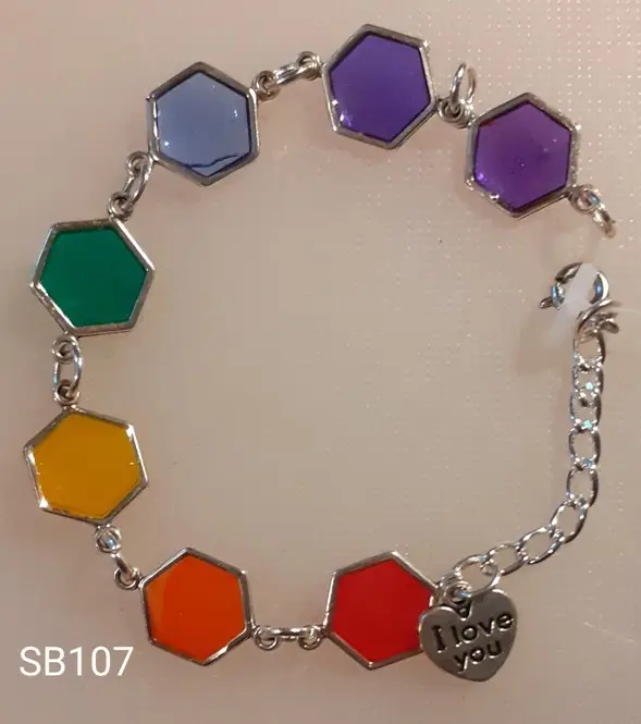 Hexagon bezels hand filled with resin to create the chakra colours, linked by hand and finished with pendant.